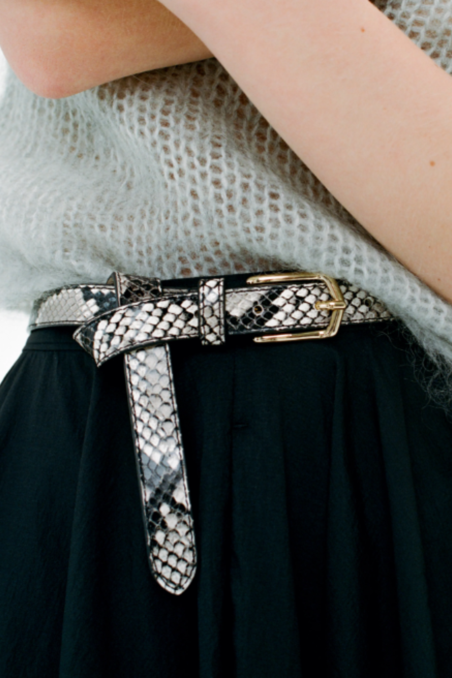 Designed with a slim silhouette, the Calvin Python is an elevated waist belt. Featuring an embossed python-print leather strap with an elongated tip to tie as you prefer and fastened with a refined gold-tone buckle.