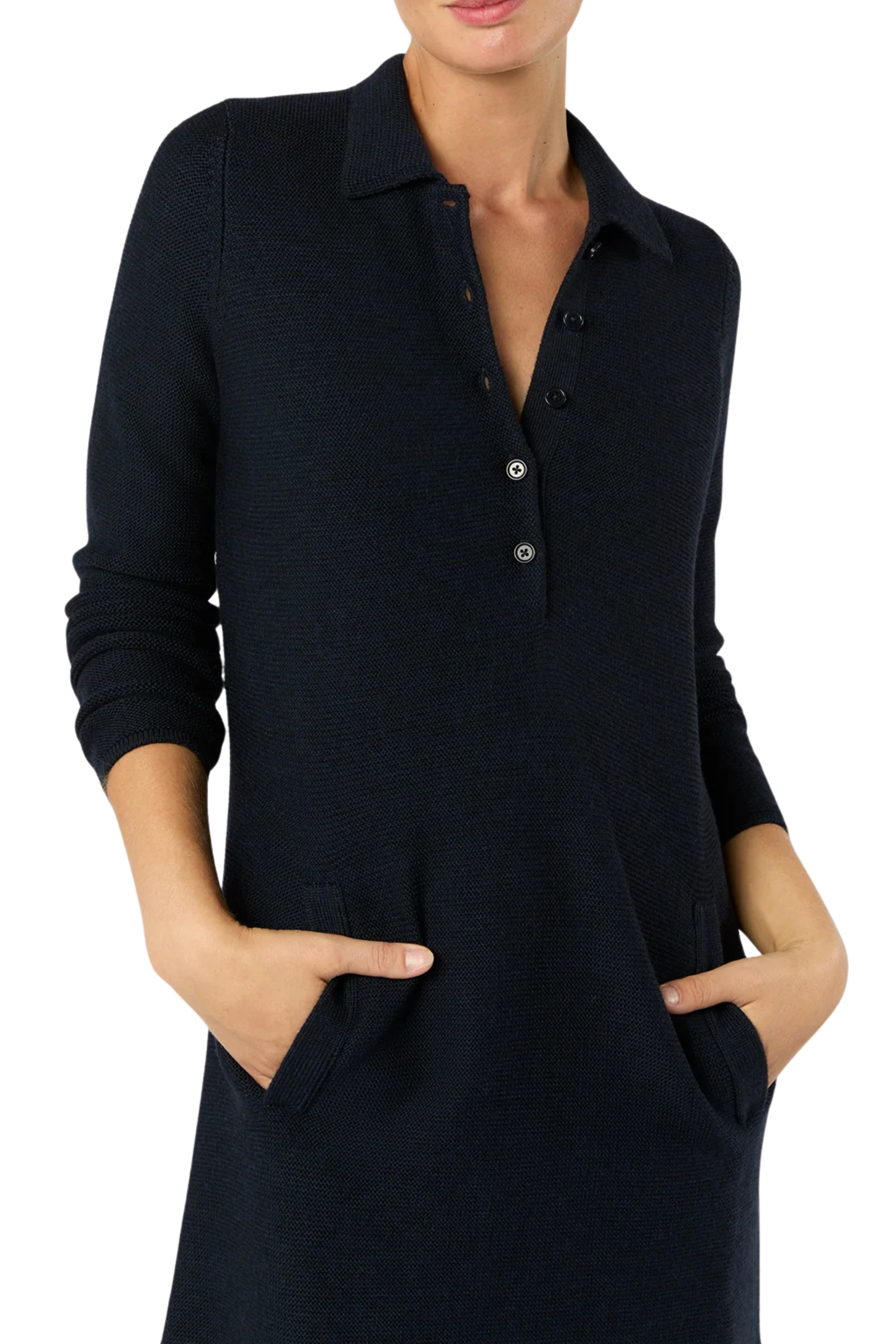 It doesn't get much easier (or softer) than this a polo-style sweater dress in extra fine merino wool with the most incredible texture. It has an easy fit through the body and a button placket deep enough to be sexy. Like a collared cocoon pair it with boots and nail the extremely rare combination of cozy and polished. PS, it has pockets!