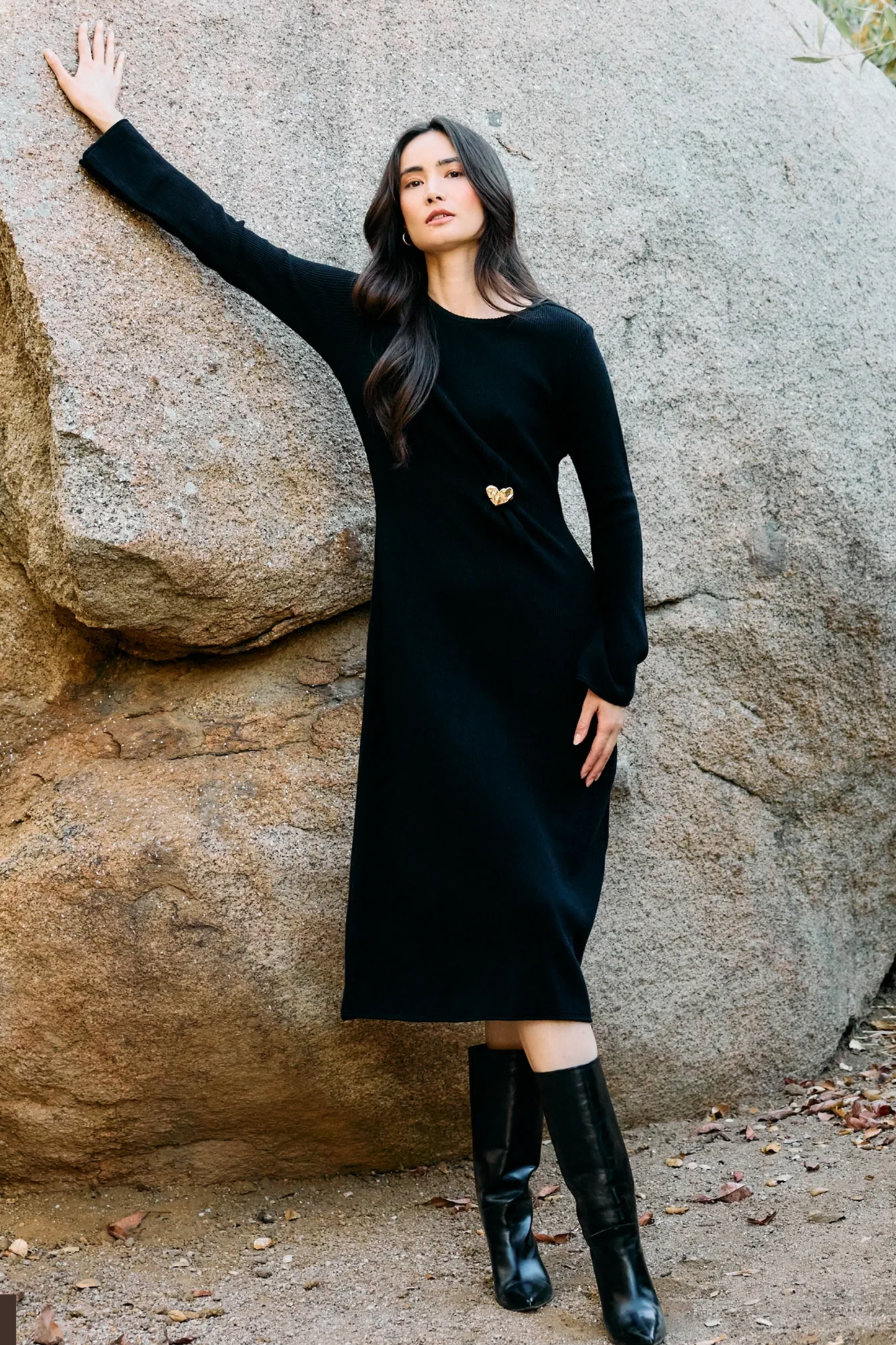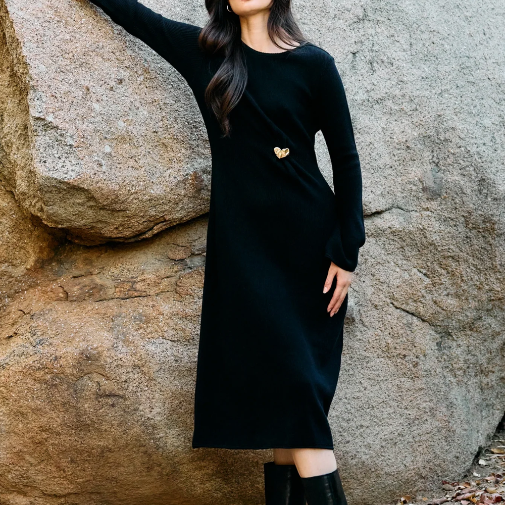 Ethically handmade in India from 100% organic cotton, the Hjarta Midi Dress is a sustainable wardrobe staple. This long-sleeve, slip-on midi silhouette features delicate heart button details and a statement imperfect heart charm detail that gathers the fabric in a flattering drape — each piece is unique, with slight variation in heart placement adding to its individual charm. Unique and one of a kind, it blends thoughtful craftsmanship with everyday ease — perfect for layering or wearing on its own.