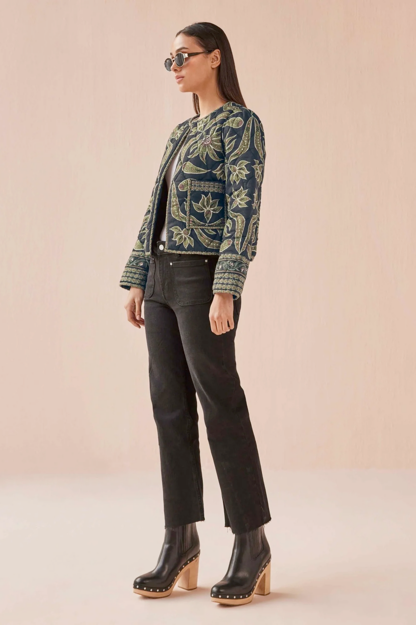 This lightweight quilted masterpiece is a celebration of Omika's art-driven process. With a rounded neckline and chic piping details that add depth to the silhouette, it perfectly showcases the handmade paintings that inspire Omika's prints.