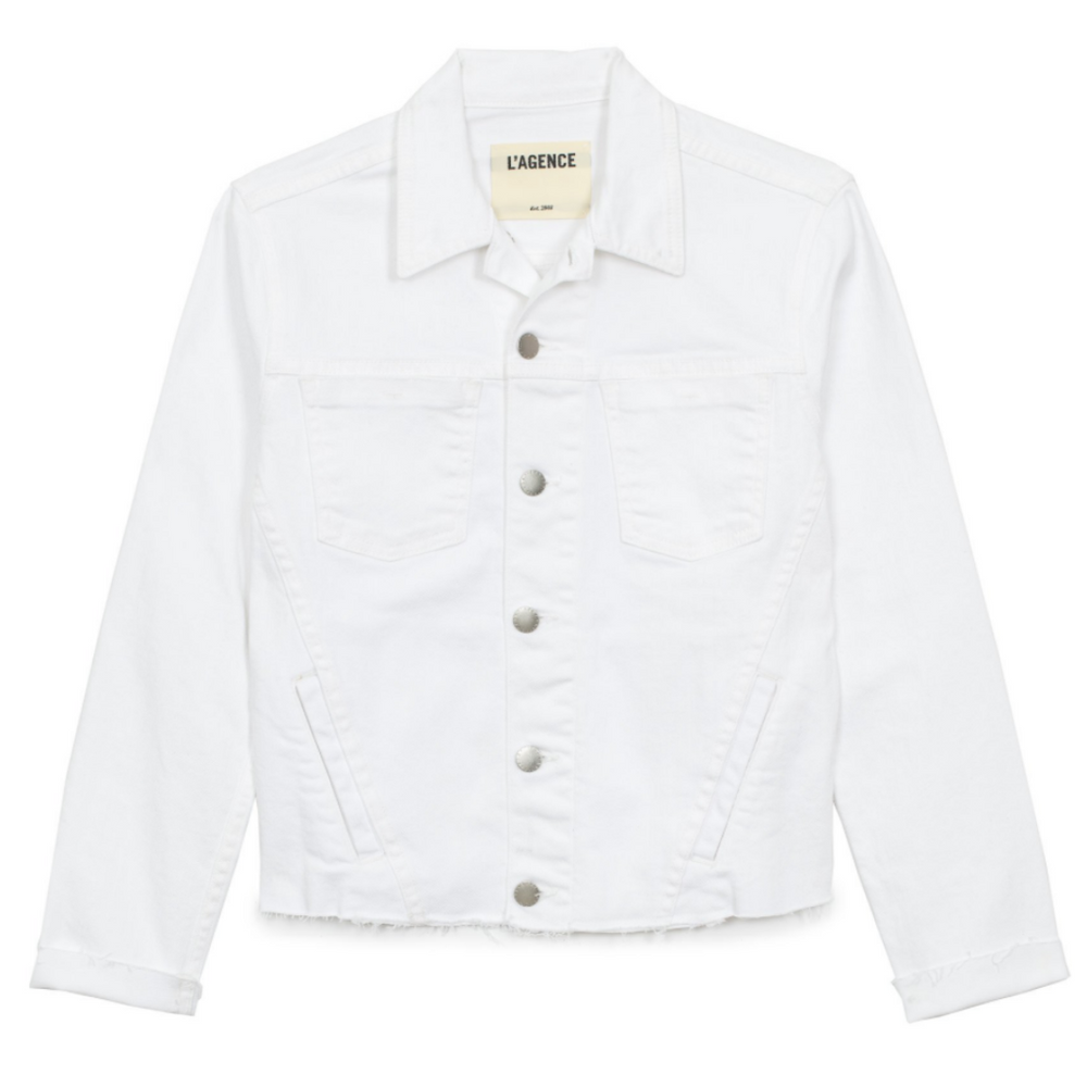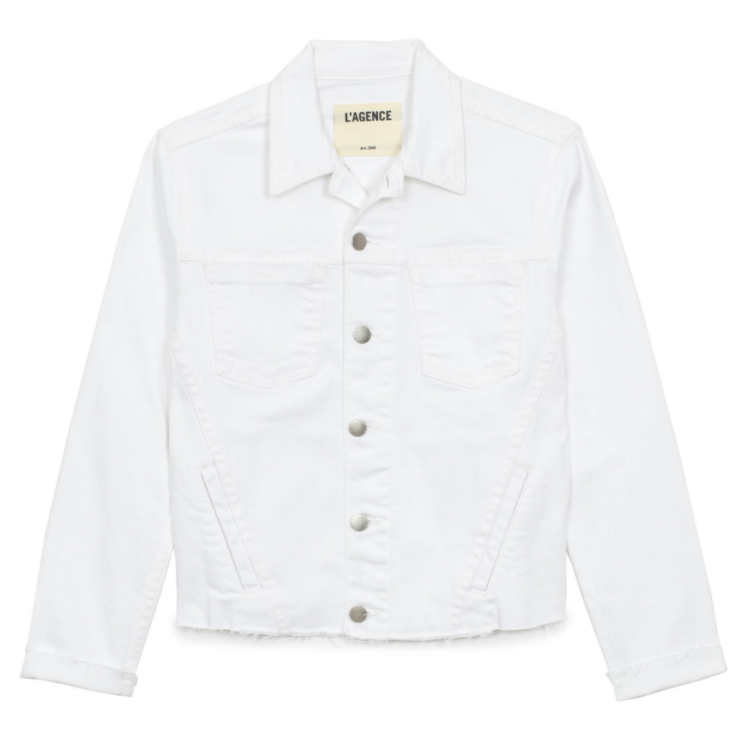 A classic denim jacket with modern updates like a raw cut hem and bracelet length sleeves with a folded raw cut cuff. A feminine design is elevated by angled seams, front patch pockets, a small feminine collar and a clean, tailored fit. Crafted from a soft pink denim, the fabric has a soft touch but with modern comfort and stretch.