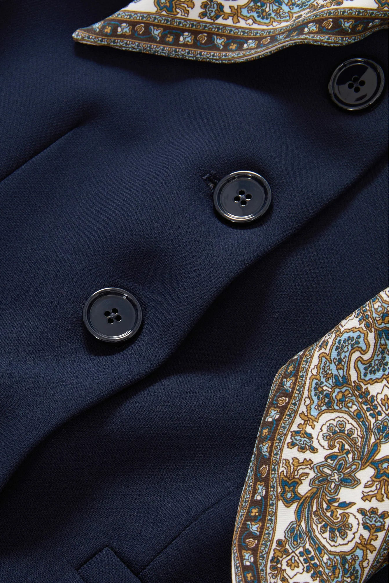 The Ismena navy jacket combines structure with comfortable stretch. Featuring a removable custom-printed foulard scarf tie and matching removable peekaboo cuffs, it offers versatile styling options. Designed with a cropped, single-breasted silhouette, it’s finished with a classic point collar and welt pockets.