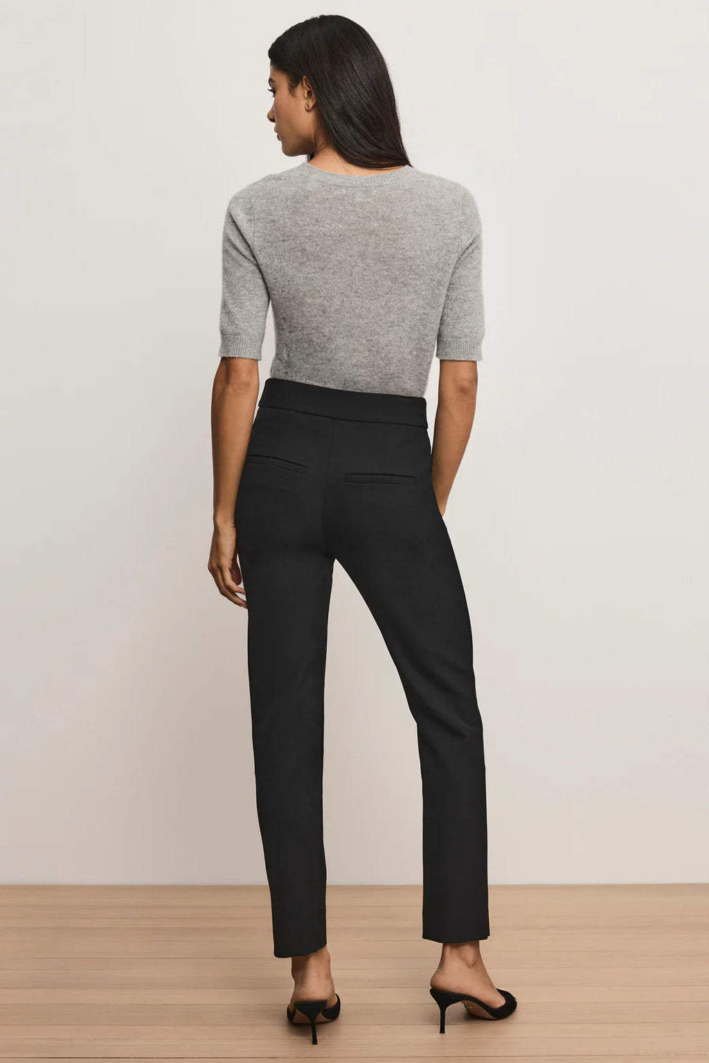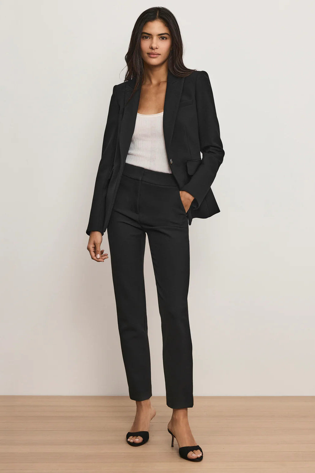 The Renzo pant you know and love—now with a sleeker finish. Crafted from Veronica Beard's bestselling Transitional Suiting fabric in black, they've removed the buttons and coin pocket for a clean, streamlined look. Everything else remains the same: a flattering high-rise waist and slim, cropped leg. A polished go-to for the office, wear it with a feminine blouse and statement heels, or pair it with the Miller Dickey Jacket for a tailored set.