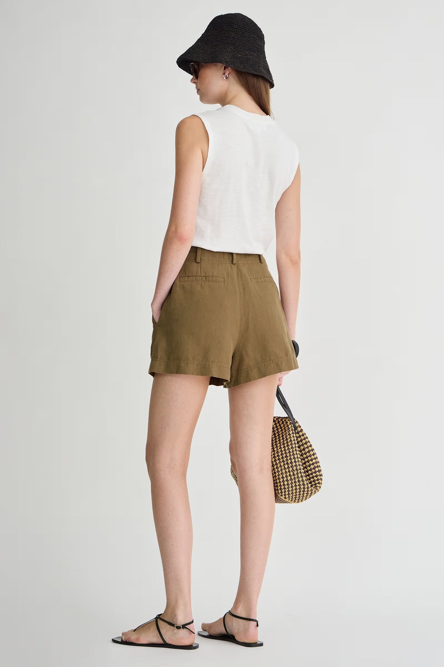 Designed with a fitted, flattering silhouette and made to pair with essential tees and flowy printed tops. High waist, front pleats, front slant pockets, back welt pockets.