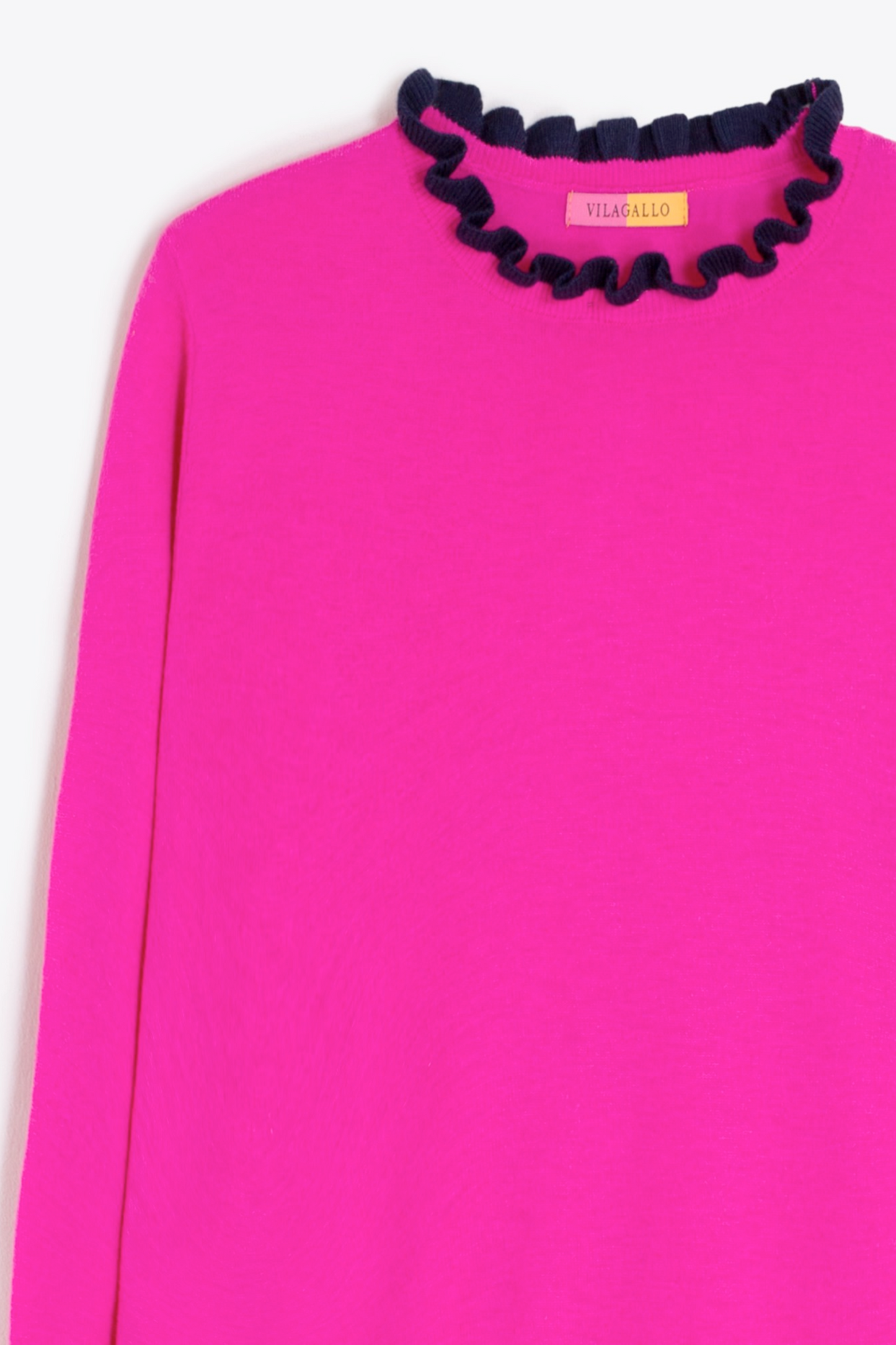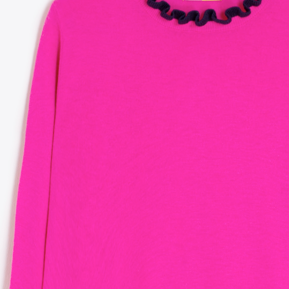 Straight-fit sweater in fine knit fabric with a soft wool blend. Features a round neckline and black pleated ruffles at both collar and cuffs. Long sleeves with ribbed cuffs and straight hem. Made from a warm and pleasant-to-touch fabric.