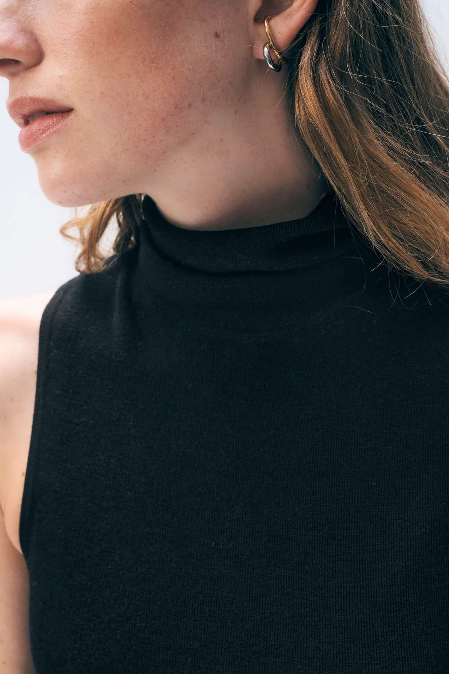 Sleek and soft, this sleeveless turtleneck in superfine merino wool offers lightweight warmth in black or Shadow Grey heather.