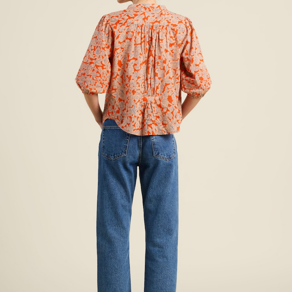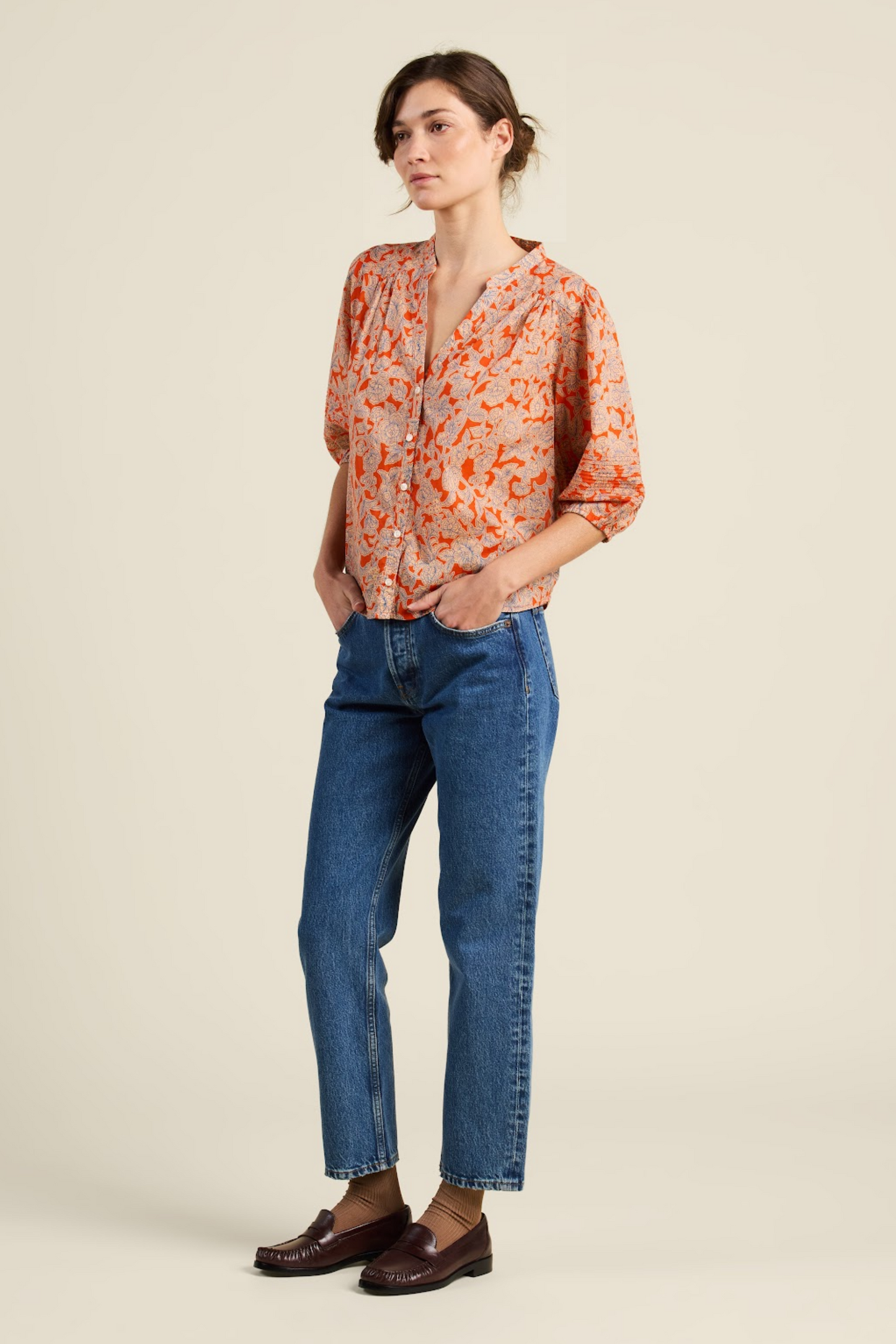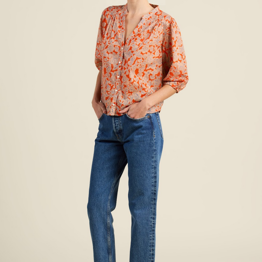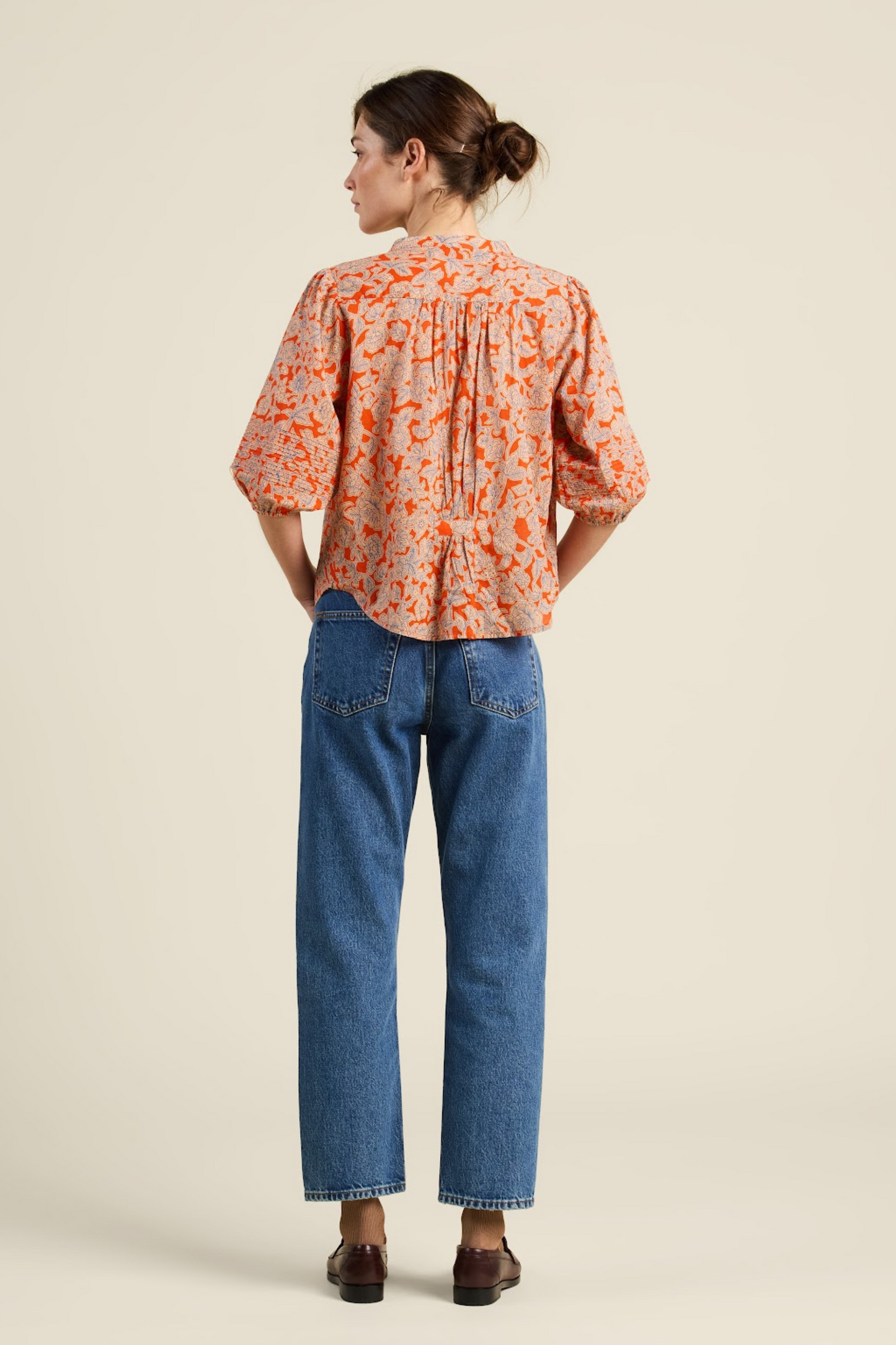 A short puff-sleeved blouse with a v-neck opening, buttoned front placket and delicate gathers at the front and back shoulders. Made from soft cotton voile, it's breathable and great for summertime light layers.