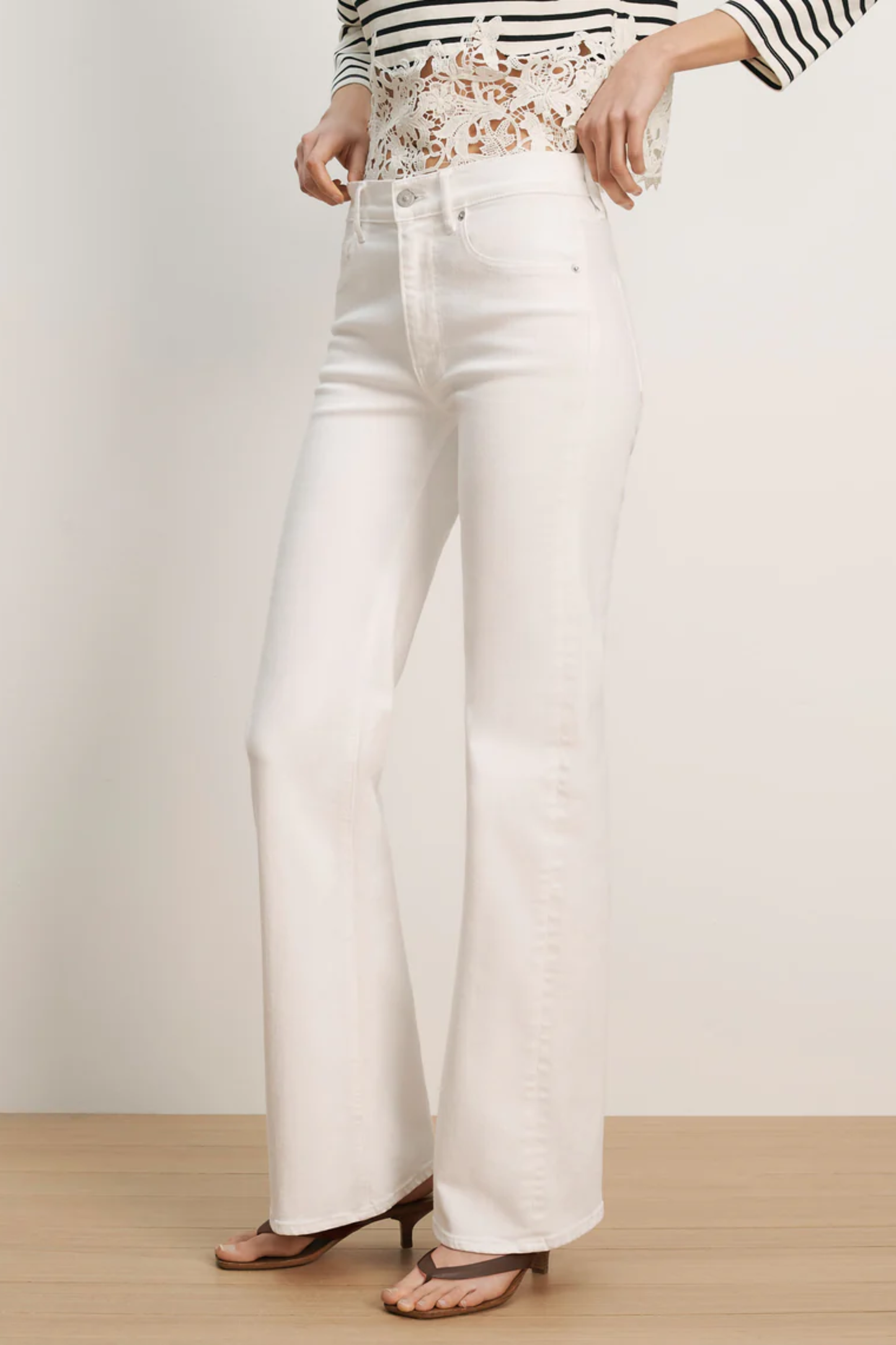 Crafted from super-stretch Japanese denim in bright white, this mid-rise, slimmed-out wide-leg jean is fitted through the hips and thighs and expertly tailored for an elongating effect. Our signature V belt loops complete the look. For an elevated take on casual-chic, pair it with a simple T-shirt and strappy heels.