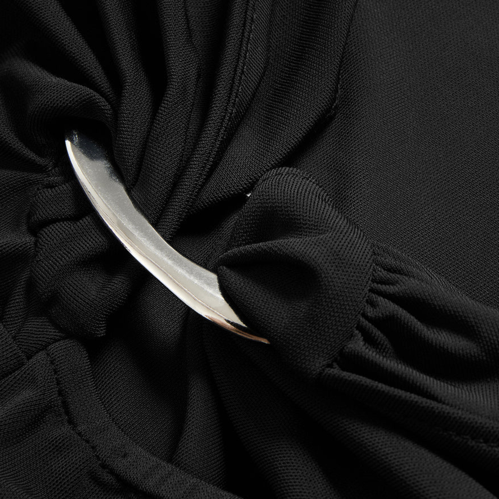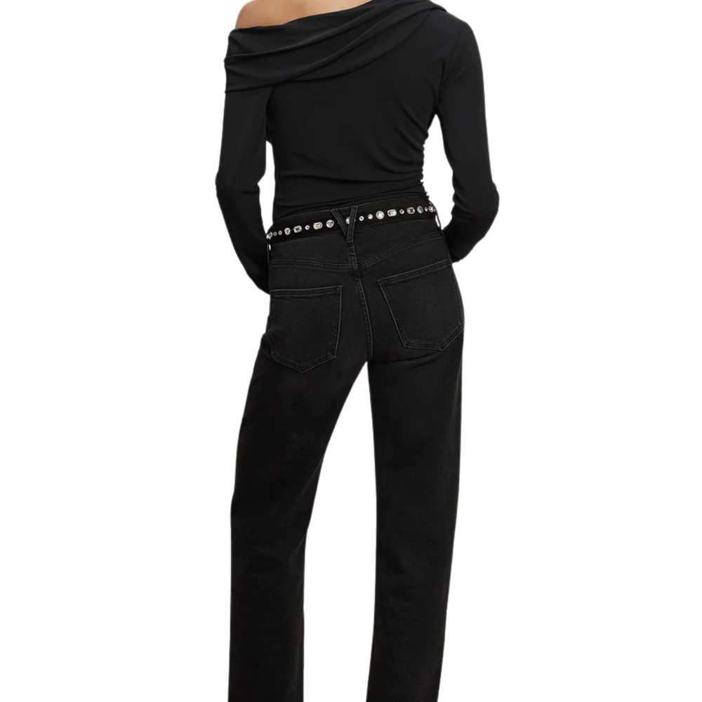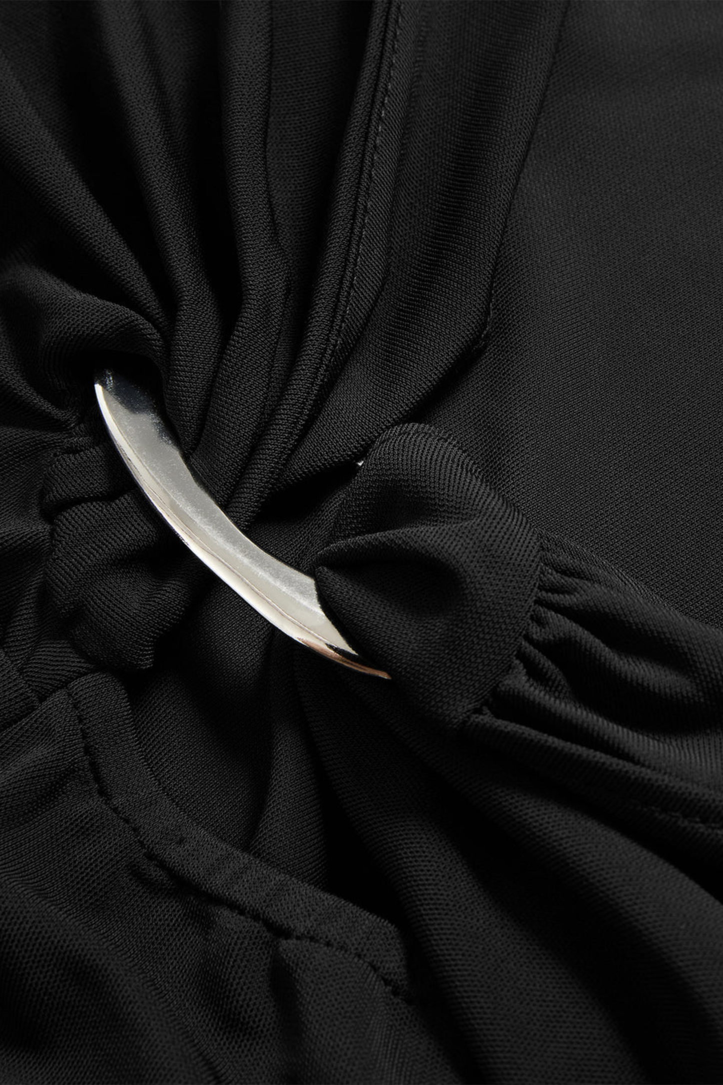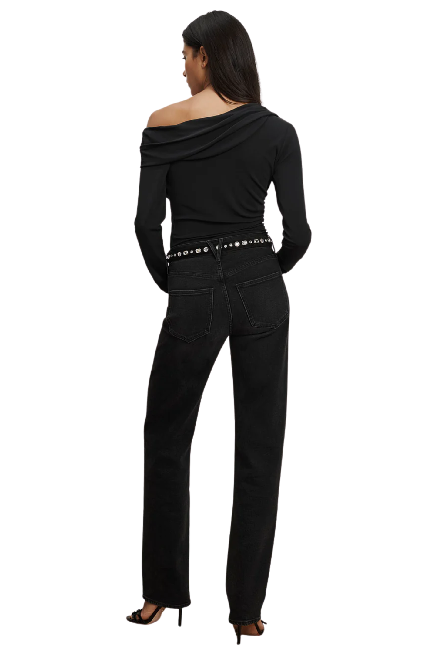 A modern take on a wardrobe essential. Crafted from black stretch jersey, the Lozea long-sleeve top is cut for a body-skimming fit with asymmetric draping and ruching throughout. A folded, off-one-shoulder neckline is secured with silver-tone hardware for a cool edge. Both a staple and a statement, pair it with denim by day or a sleek mini skirt after dark.