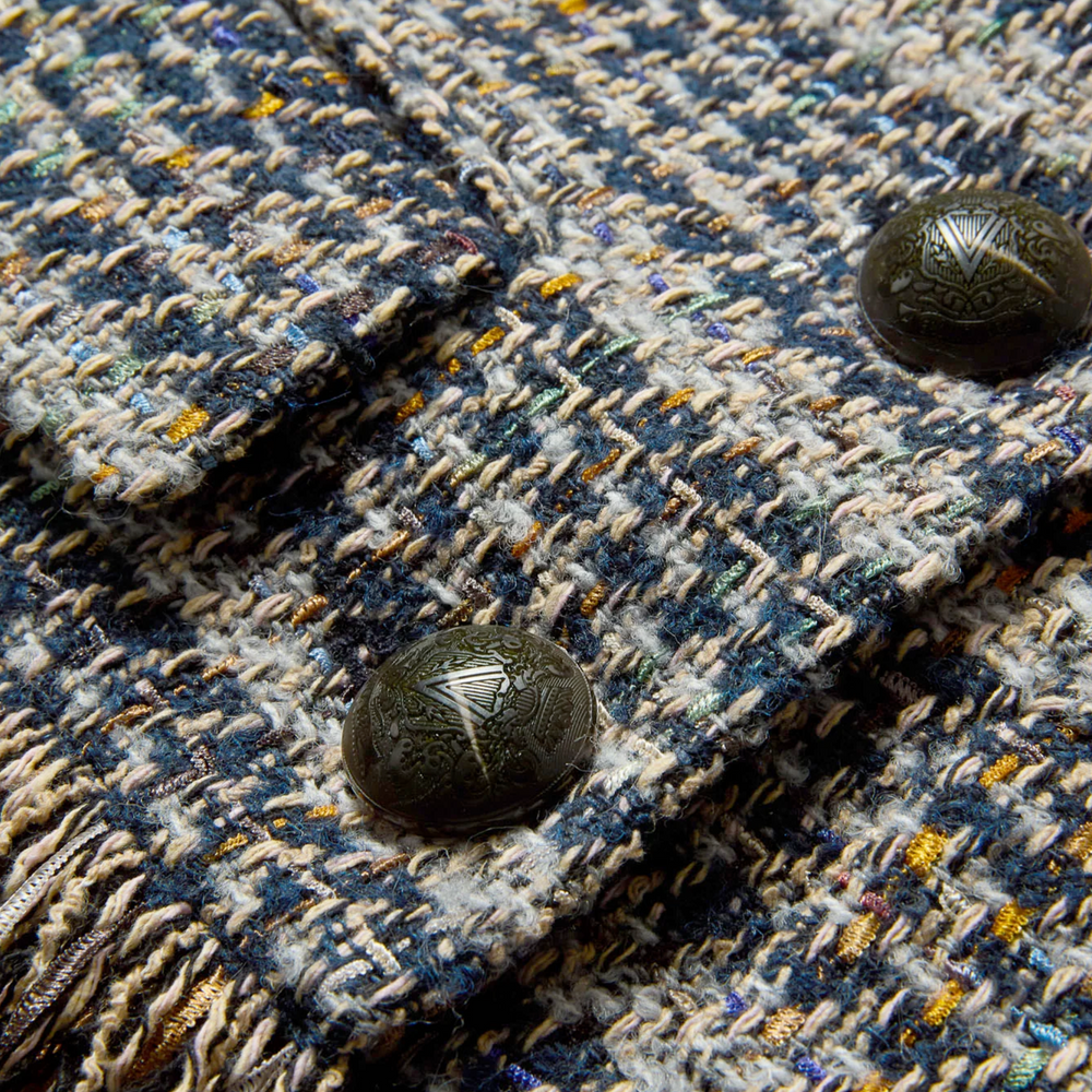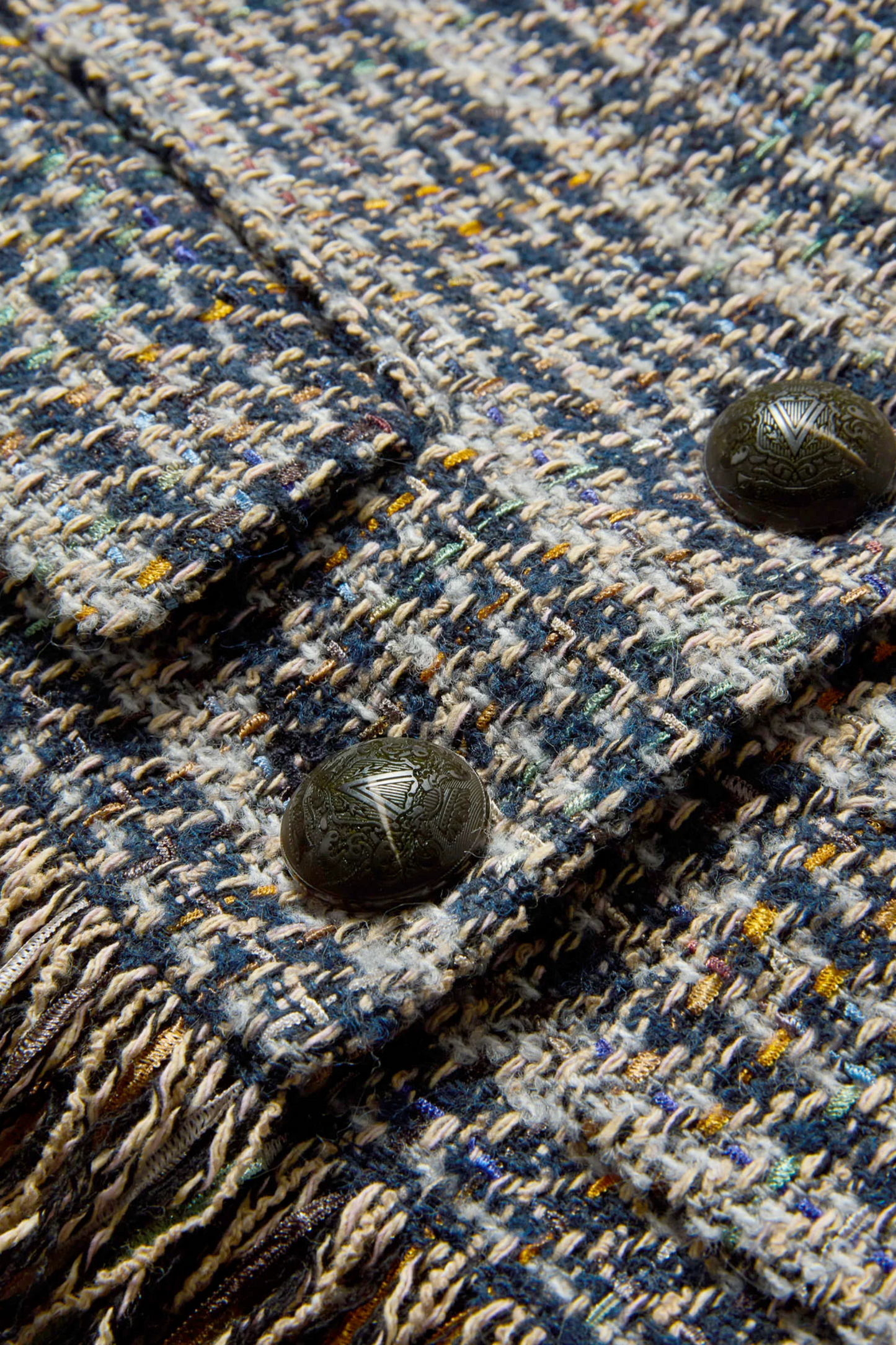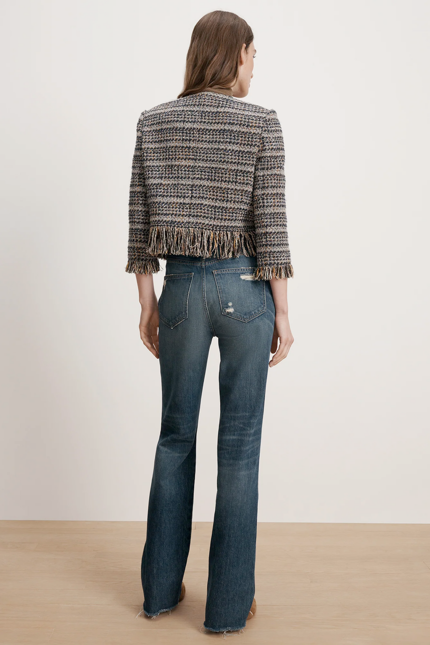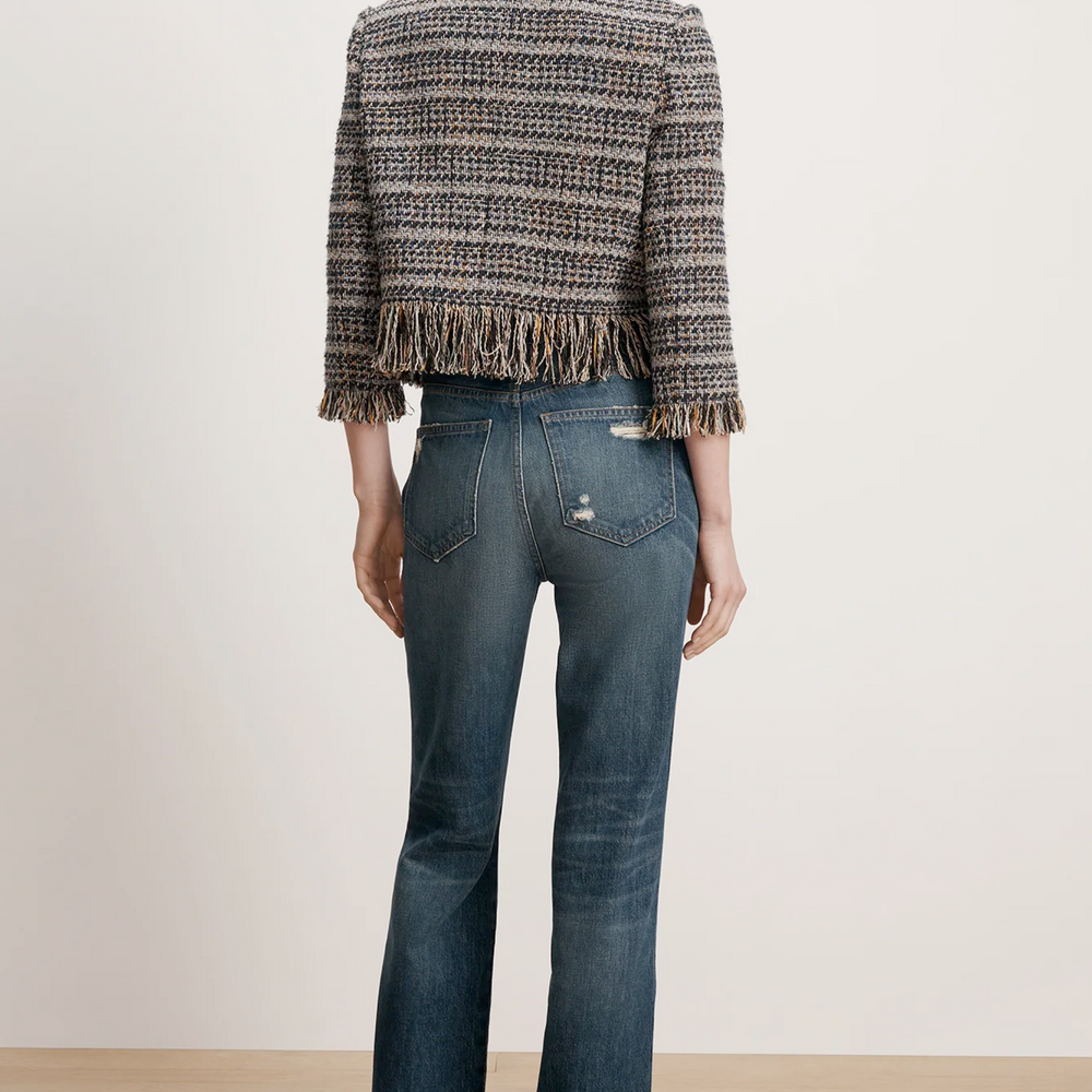 Crafted from premium Italian tweed, the Lyons features a collarless, cropped silhouette with a boxy fit, accented with multicolored fringe at the hem and sleeves for a playful, unexpected finish. Three-quarter sleeves and flap pockets complete the look. A versatile piece, wear it buttoned up as a chic one-and-done top—or layer it over a cashmere knit or tee.