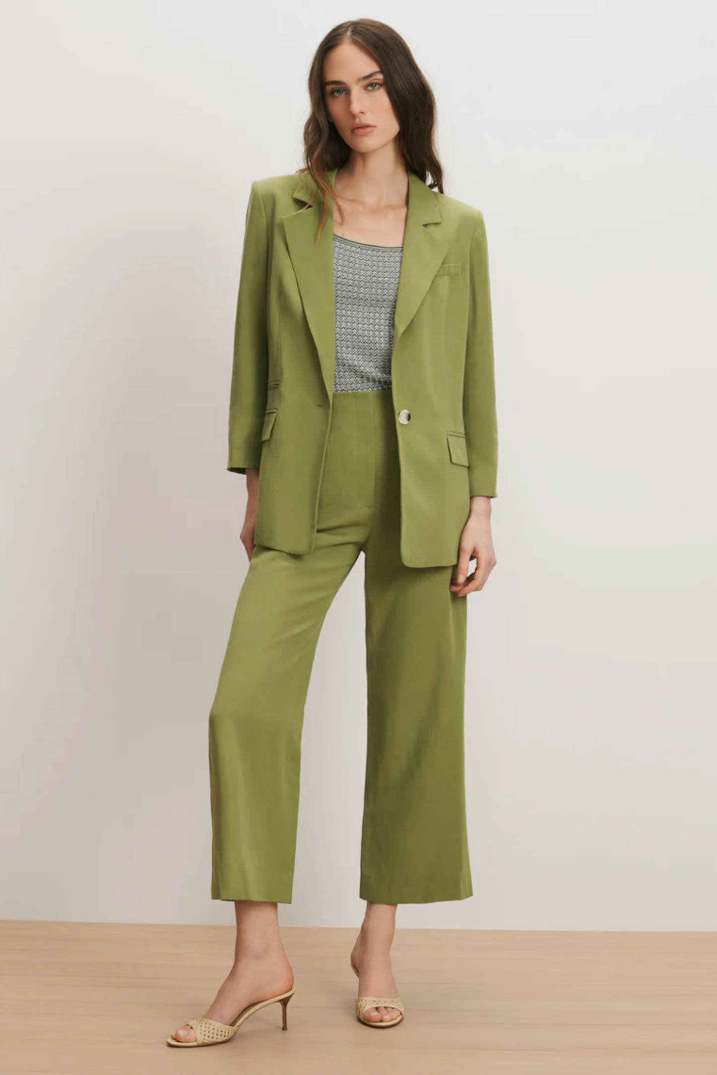 Expertly tailored from Italian linen twill with subtle stretch, the McGowan dickey jacket is a timeless single-breasted silhouette in standout olive green. It features a relaxed fit, a notch collar, padded shoulders, and welt and flap pockets.