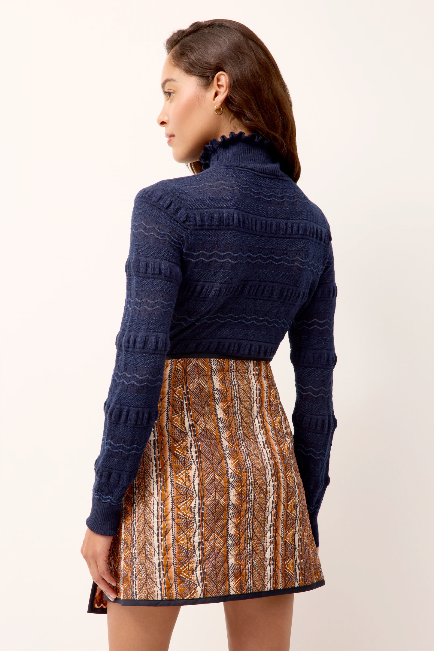 Your new favorite body-skimming turtleneck gets a feminine upgrade with allover folded ruffle details, plus a delicate pointelle knit woven with metallic yarn for a subtle shimmer.