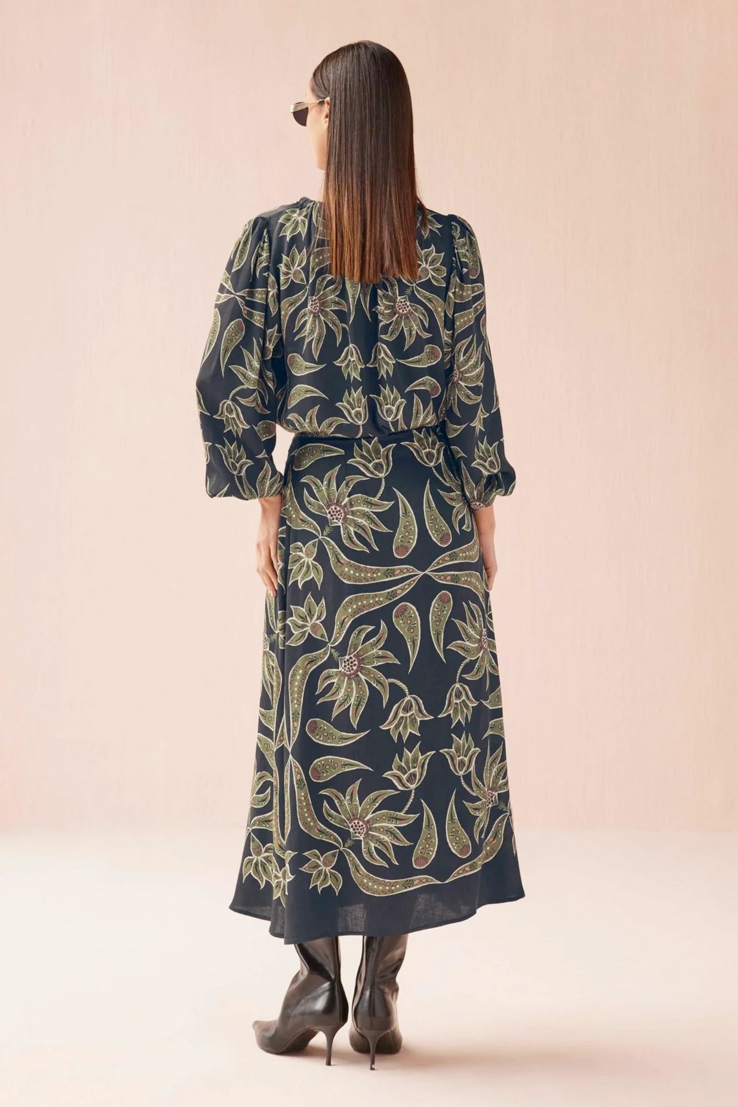 This one stars a beautifully balanced shape with billowing sleeves that cuff at the wrist and a gathered, pleat-like neckline—a very chic canvas for Omika's hand-painted designs. Find the matching Nalini Wrap skirt on our site!