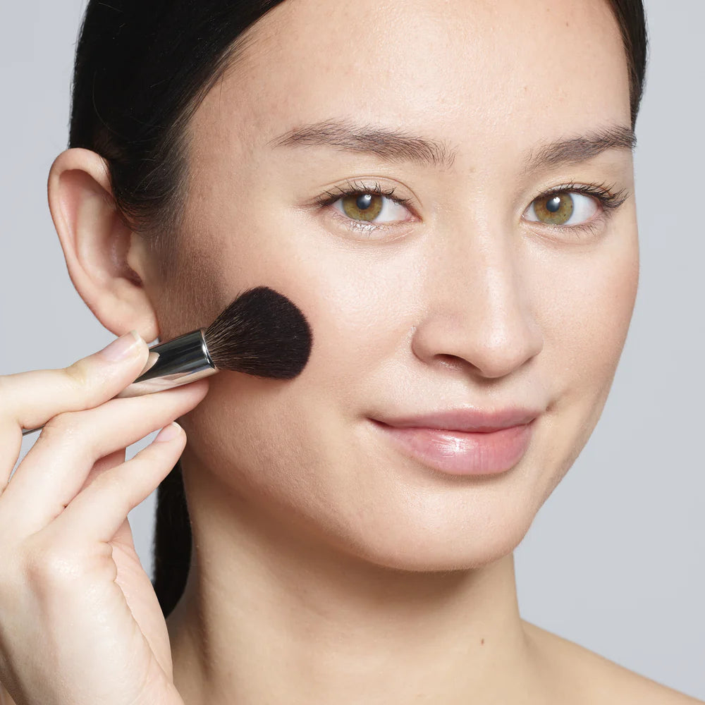 Utilize your Trish blush brush to gather the color, remove any excess, and test it on the back of your hand. Proceed to smile and gently apply the blush to the apple of your cheek, which is the highest point of your cheek when you smile. Ensure to sweep the brush slightly outwards, but never extend beyond the eyebrow. Carefully blend until the color disappears into the skin.