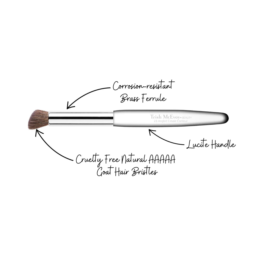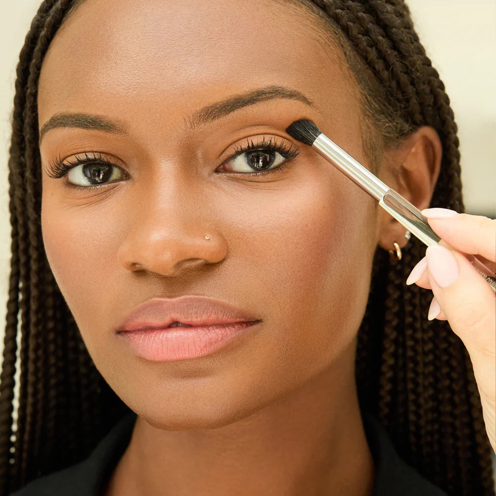 Press the brush into eye color. Press the top of the brush onto back of hand or tissue to remove excess and test color. For a full-coverage eye shadow application, press the flat side of the brush onto the lid. For crease contour, sweep the angled tip of the brush into the crease of the eye, working it in a windshield wiper motion until color is seamlessly blended.