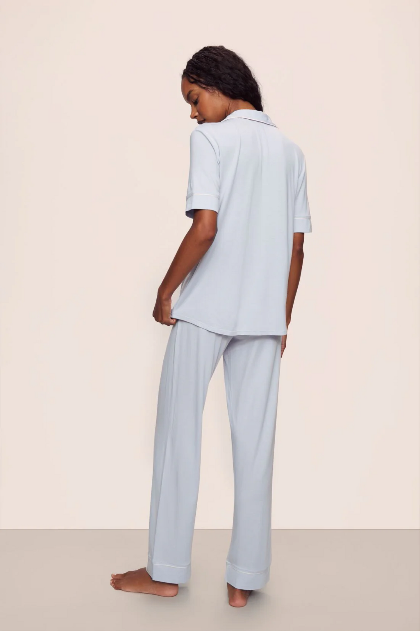 Made from TENCEL™ Modal fibers and a touch of elastane, this buttery soft fabric is verified by OEKO-TEX® Standard 100, meaning it’s dyed with safe and non-toxic dyes. This set features a classic fit top with elbow-length sleeves, a button front, notch collar, and functional pocket. The low-rise straight leg pant features an elastic waistband and contrast piping for a polished look.