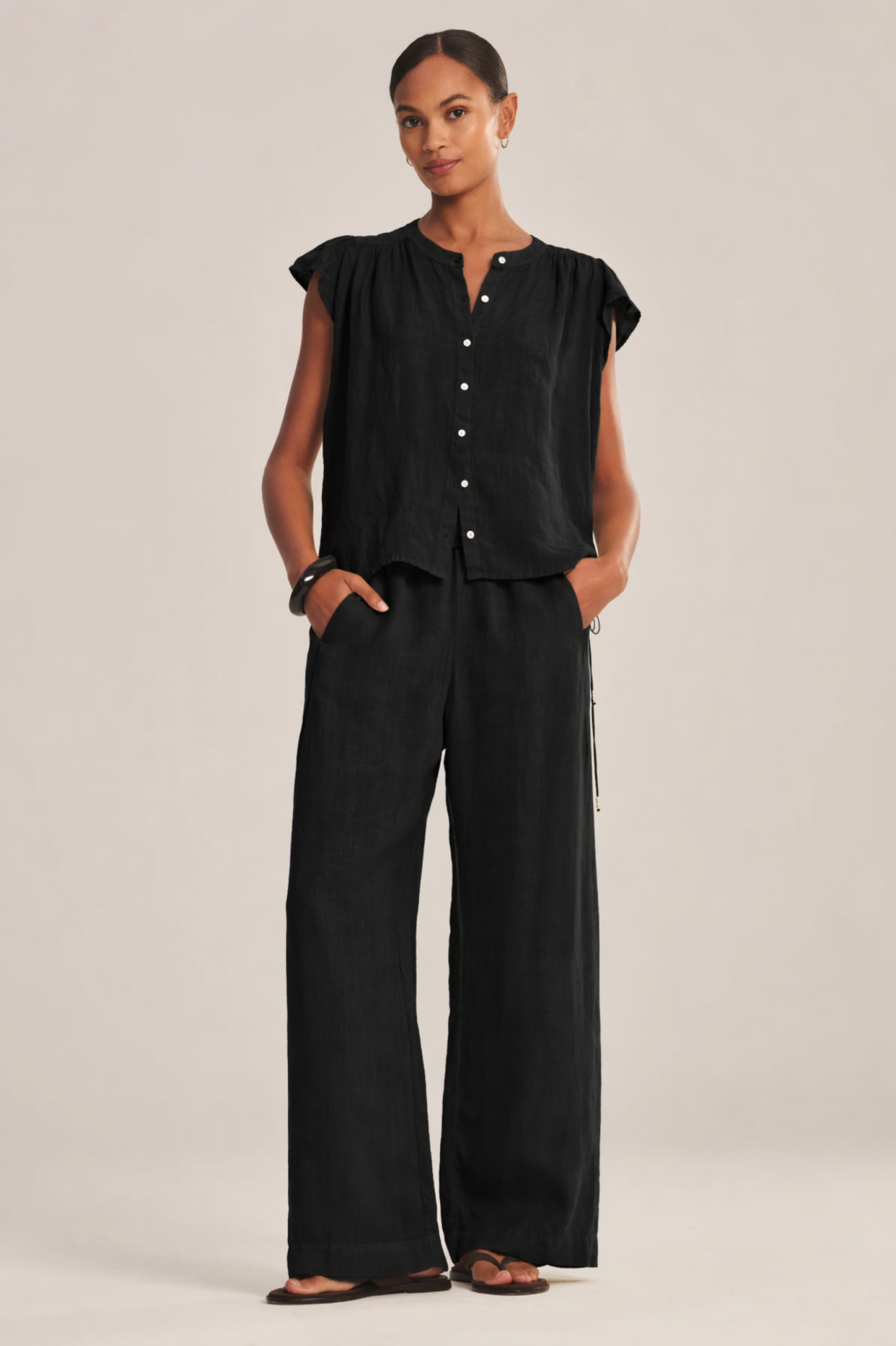 Crafted from breathable woven linen, this top offers a relaxed, airy fit perfect for warmer days. It features a button-front closure, flutter sleeves, and subtle pleat-rouched detailing along the front shoulders and back for added texture and movement. Effortlessly stylish, it’s a versatile piece that can be dressed up or worn casually.