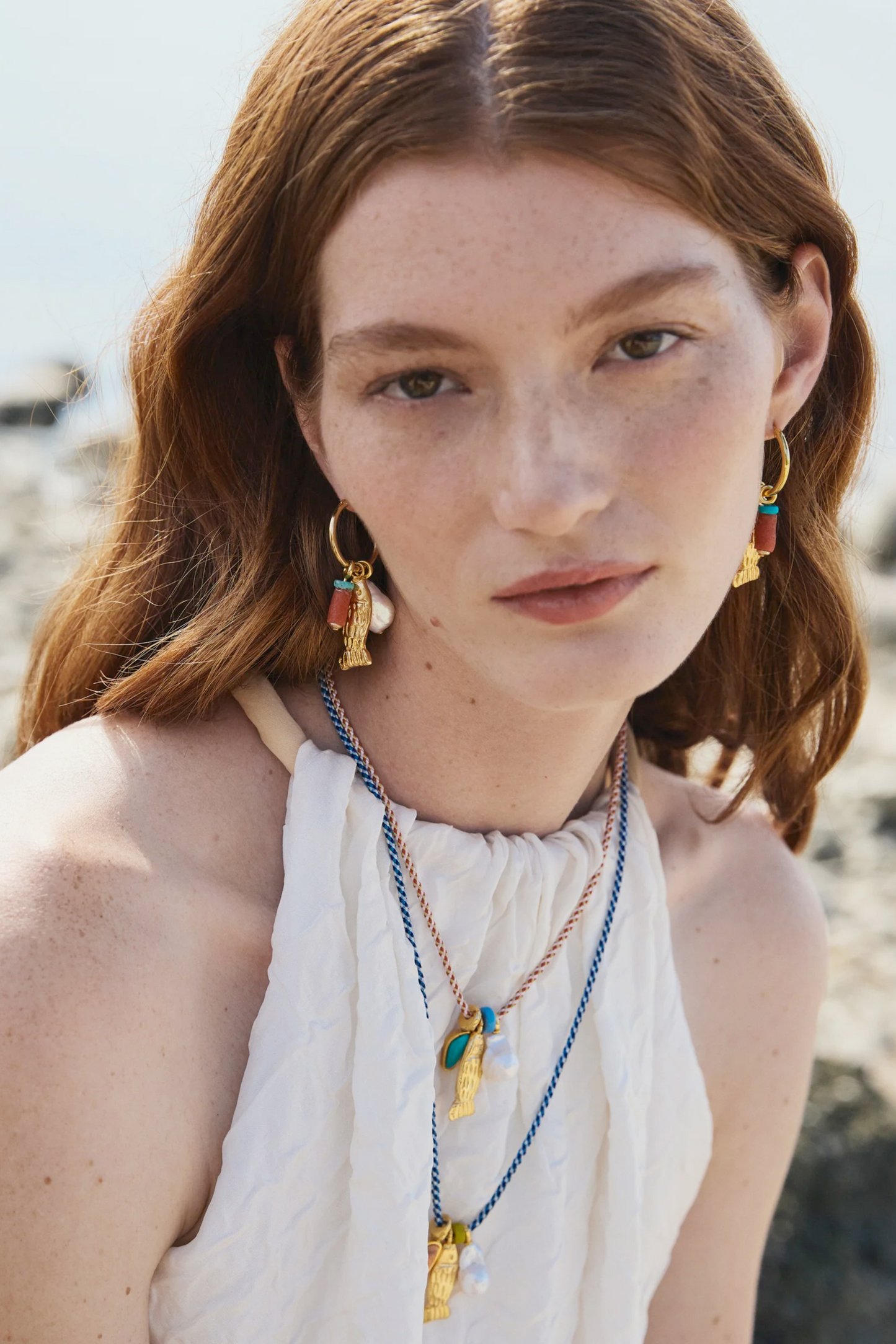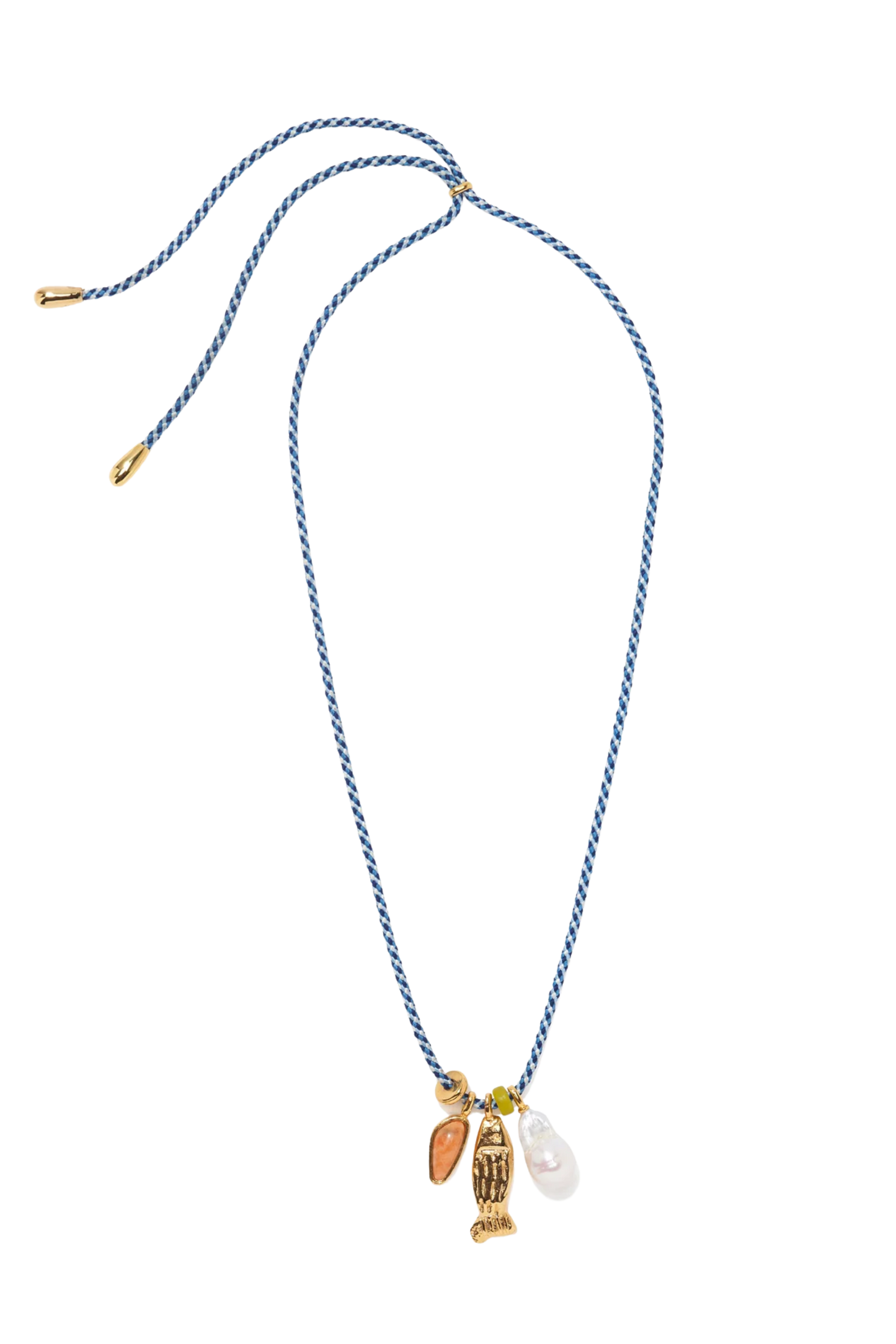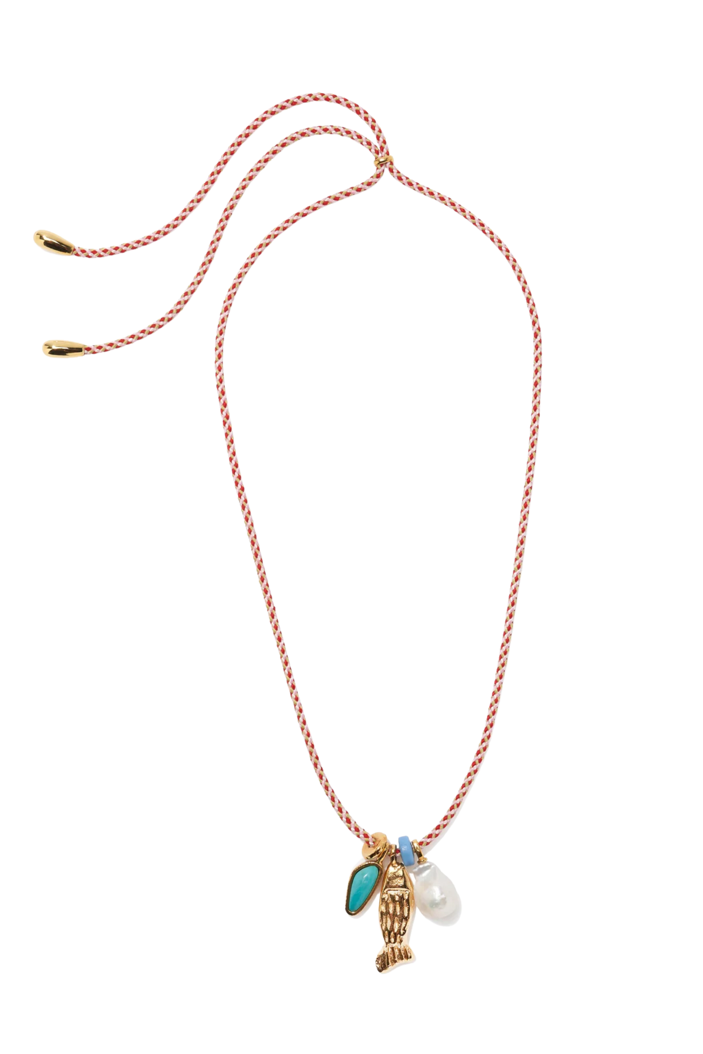Regular price $100.00We've reeled in the most adorable charm necklace this season, featuring an adjustable silk cord with gold-plated bead accents, a glass charm, hanging gold-plated etched fish pendant, freshwater pearl, and turquoise stone charms.