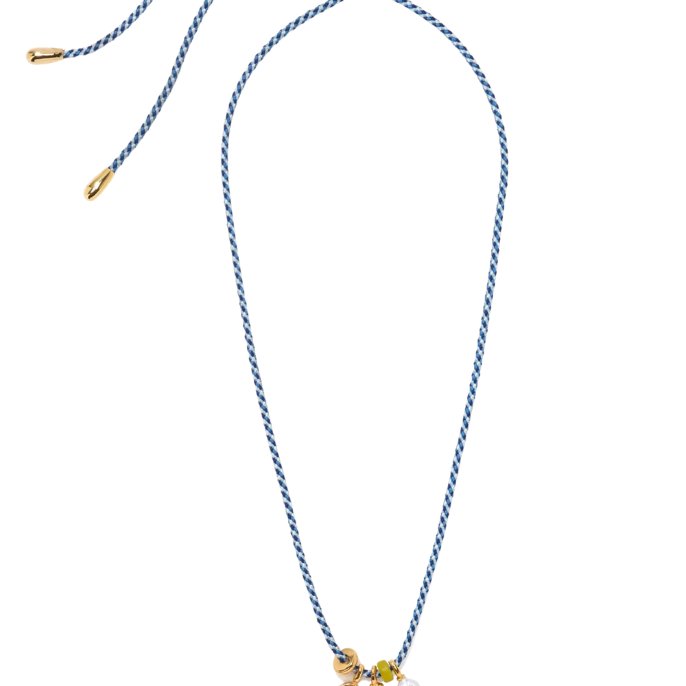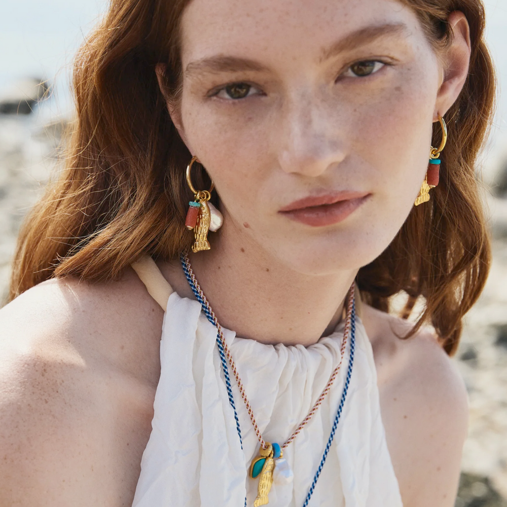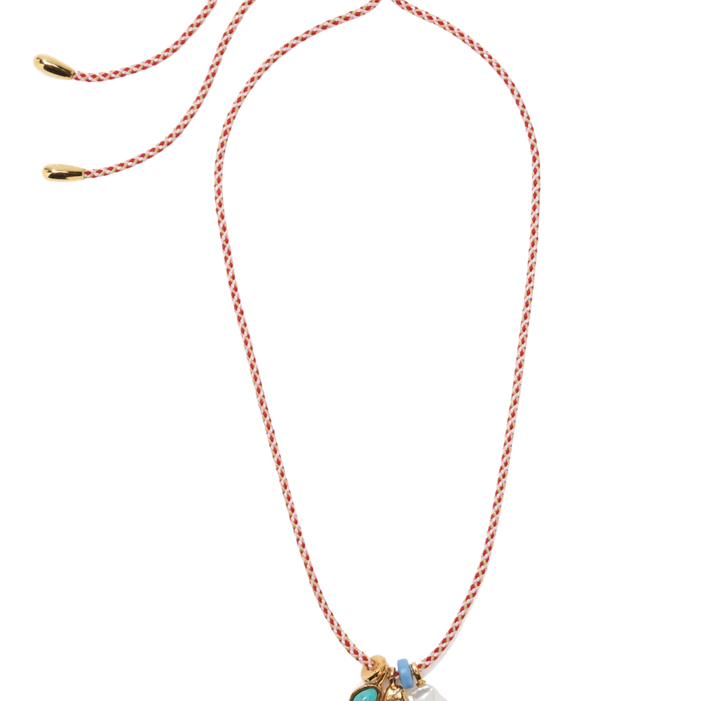 Regular price $100.00We've reeled in the most adorable charm necklace this season, featuring an adjustable silk cord with gold-plated bead accents, a glass charm, hanging gold-plated etched fish pendant, freshwater pearl, and turquoise stone charms.