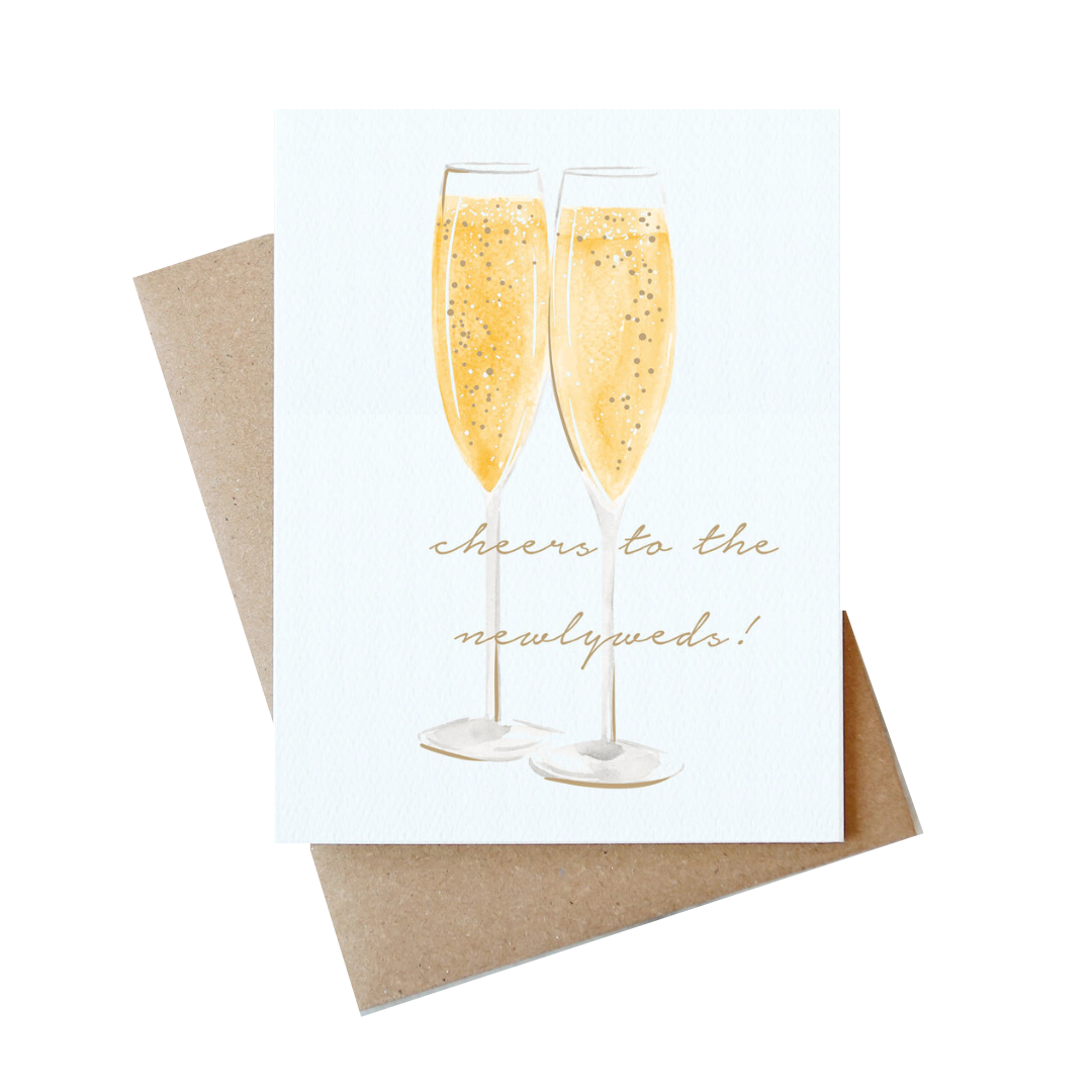 Our newlyweds wedding card features hand painted champagne glasses with gold foil accents on a white background. This card is perfect for wishing any couple a happy day for their engagement, wedding, or bridal shower.