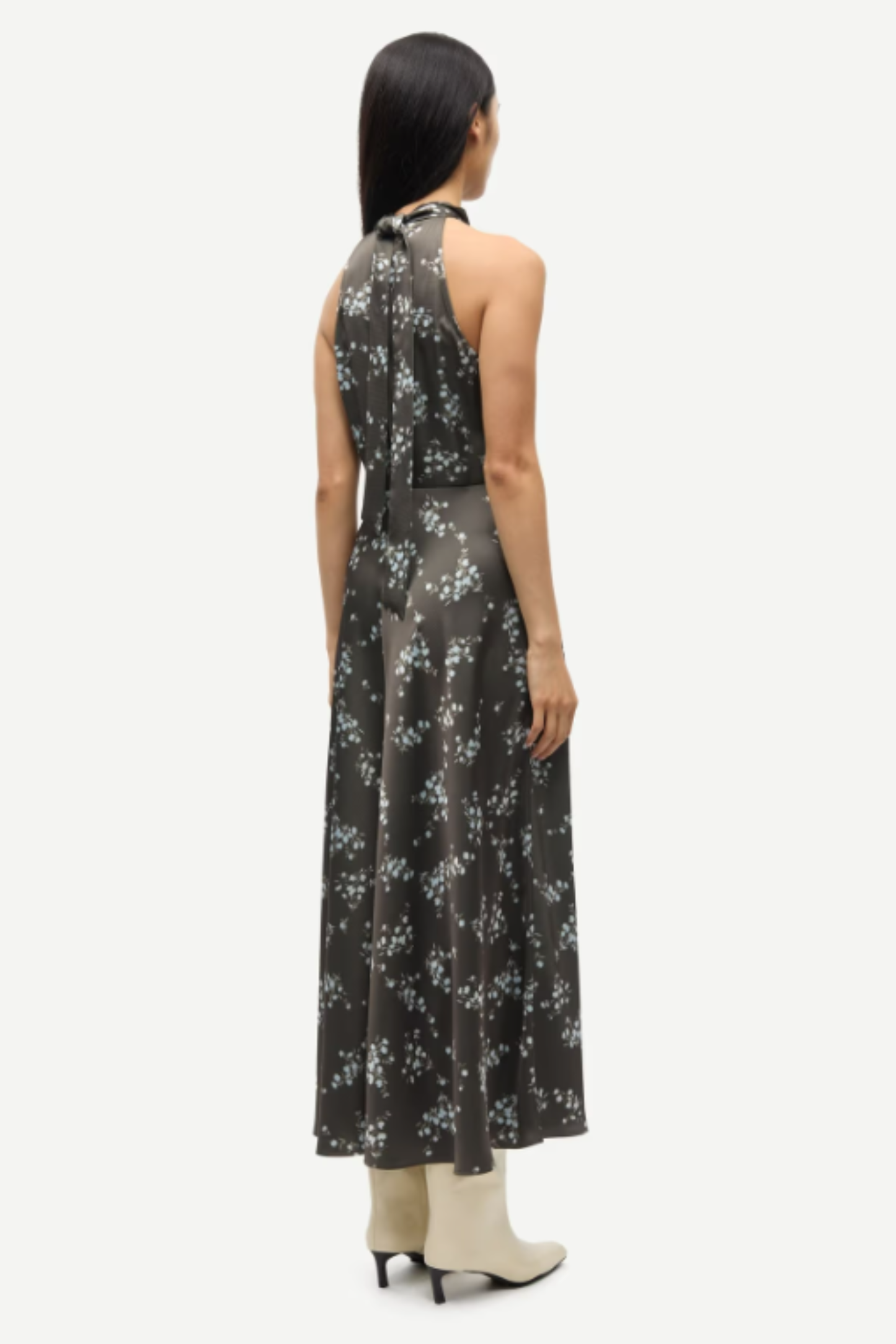 The Rheo dress is truly seasonless and a versatile silhouette to have in your closet. The Rheo is a sleeveless satin midi dress with a true to size fit, slightly a-line skirt, and self-tie closure at the back of the neck with a concealed side zip.