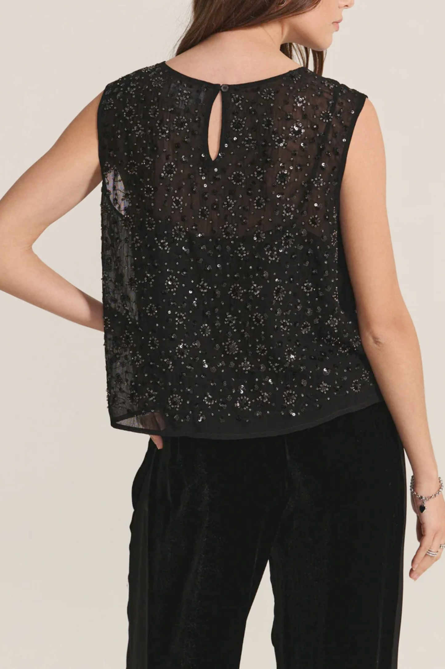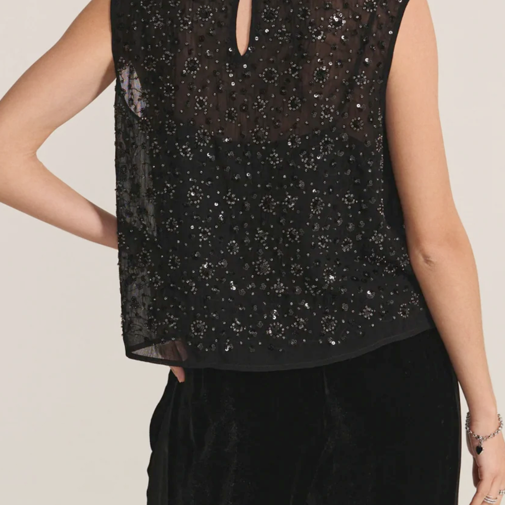 Add a touch of sparkle to your evening look with this elegant black sleeveless top. Featuring shimmering sequins throughout, this piece brings effortless glamour to any outfit. The relaxed, slightly boxy fit offers comfort while maintaining a chic silhouette. Perfect for pairing with tailored trousers or a sleek skirt, this top transitions seamlessly from cocktail hour to a night out.