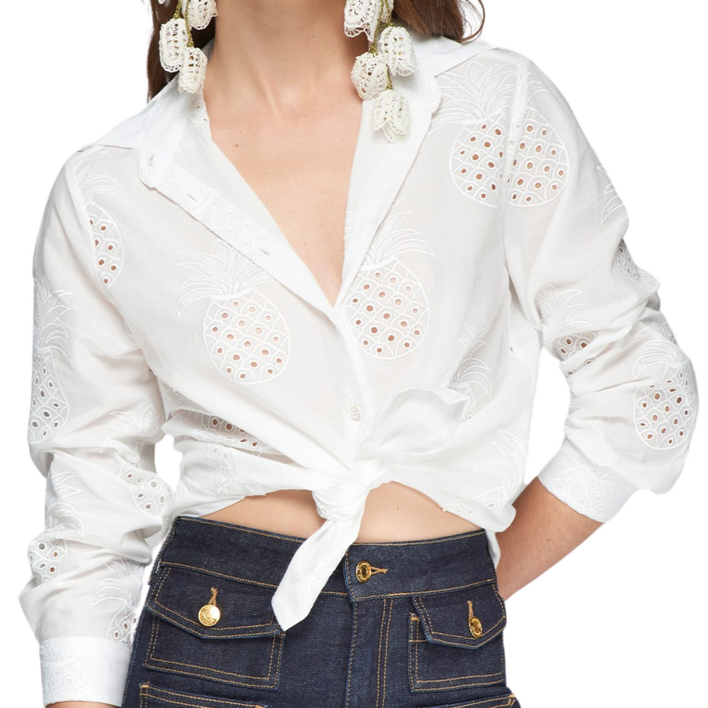 White shirt with embroidered pineapples. Front fastening with shirt buttons. Long sleeves with cuffs. 100% cotton.
