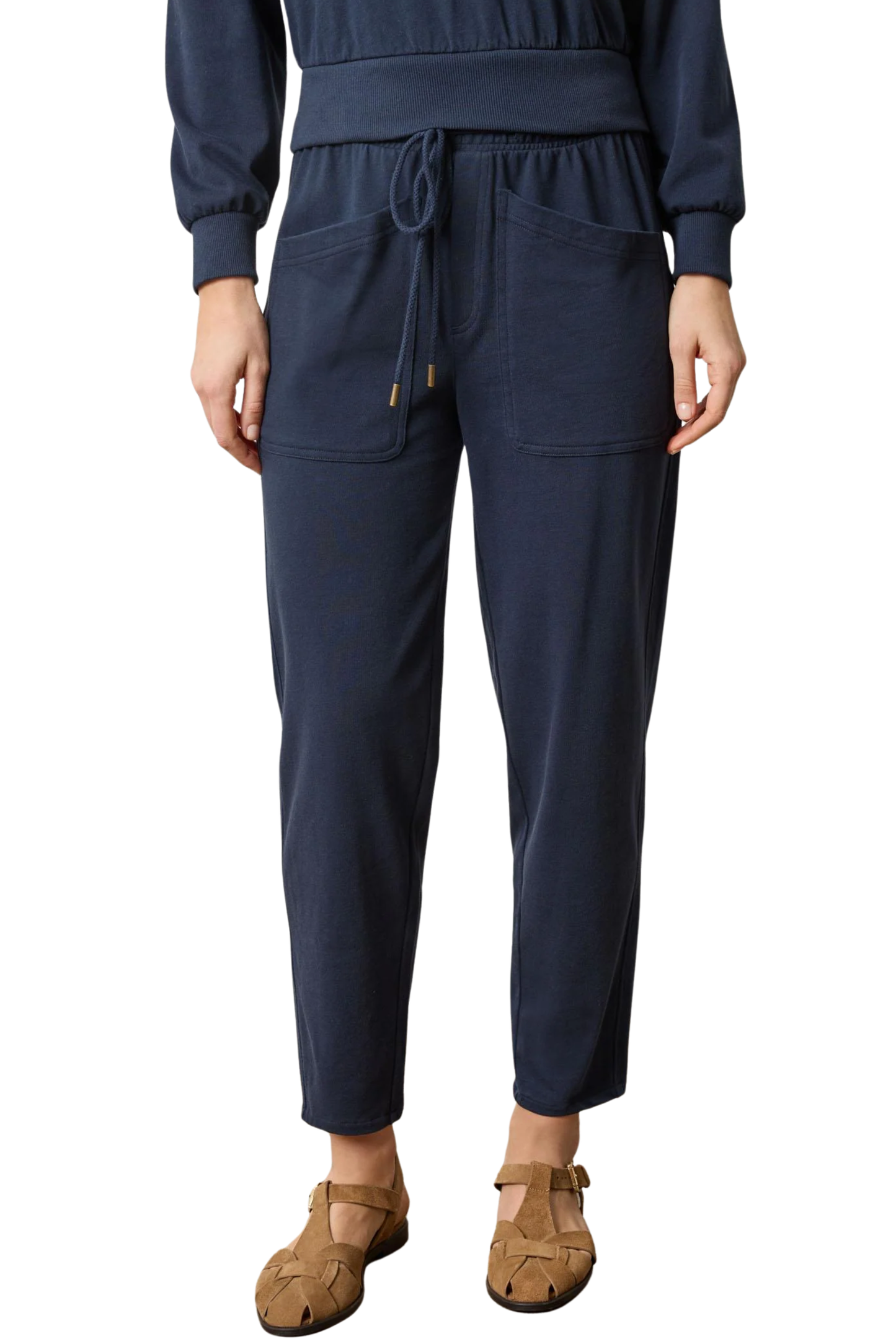 The Utility Pocket Pant in our Structured Knit, a slightly heavier-weight compact jersey that holds its shape beautifully, is an elevated take on everyday sweatpants. Designed with an elastic waist and drawcord for comfort, the slanted front pockets create a flattering, elongating effect. The slightly tapered leg hits at the ankle, making it easy to pair with one of the coordinating tops or your favorite sweater. Casual yet refined, this is a go-to pant for a chic, effortless look.