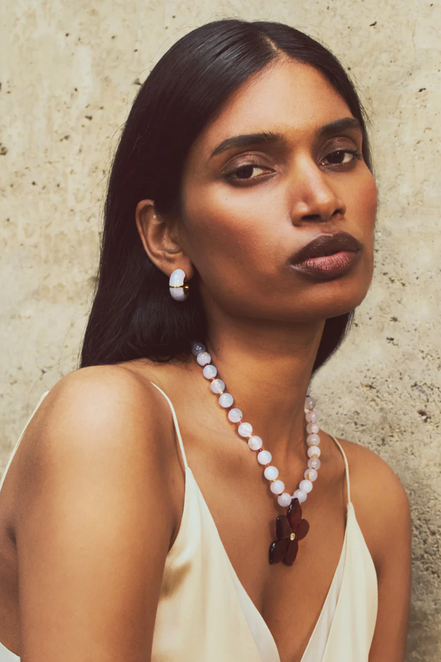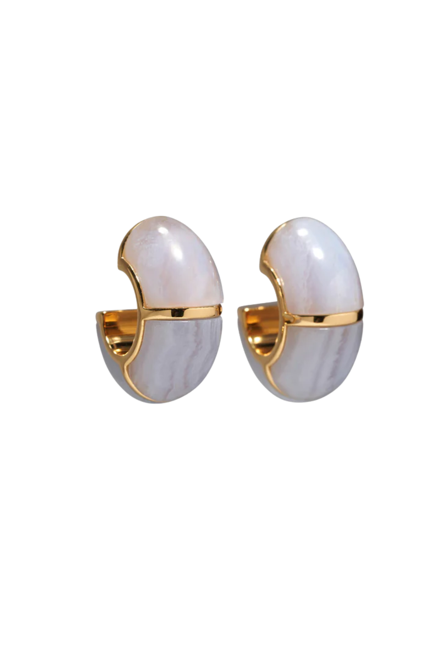 The design team took inspiration from the traditional glazed Zellige tiles handcrafted in Morocco and created these hoops, our freshest new silhouette in gold-plated brass with a marbled blue lace agate stone inlay.